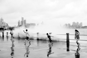 7月12日,人们躲避青岛海边巨浪。 新华社发