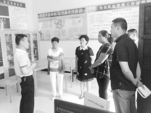连日来,由商水县纪委常委带队,抽调财政、审计等部门相关人员组成8个考核组,分赴全县各级党委(党组)、纪委(纪检组)检查考核2015年上半年落实党风廉政建设党委主体责任和纪委监督责任情况。图为考核组在姚集乡赵黄庄村考核。记者 岳建辉 摄