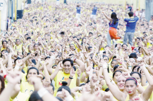 万人齐跳尊巴舞 7月19日,在菲律宾曼达卢永市,爱好者共舞尊巴。当日,12975名爱好者齐聚曼达卢永市共跳尊巴健身舞,刷新了吉尼斯世界纪录。