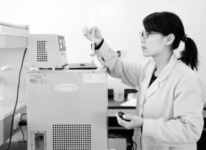 7月20日,郸城县金丹乳酸科研室一名实验员在认真操作。该县年产值亿元规模以上的金丹乳酸、财鑫糖业、上海迪冉、天豫薯业等生物资源加工企业,通过不断加大科技投入力度,自主创新能力得到增强,高新技术产品不断增加,企业核心竞争力明显提升。(记者 沈湛 摄)