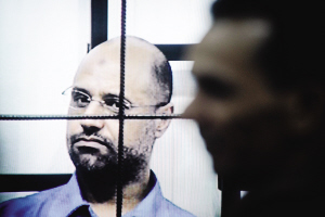 卡扎菲次子被判死刑 7月28日,利比亚一家法院宣布判处包括卡扎菲次子赛义夫·伊斯兰·卡扎菲在内的多名卡扎菲政权高官死刑。这是2014年4月27日卡扎菲次子赛义夫在利比亚津坦通过视频会议软件接受审讯的照片。新华社发