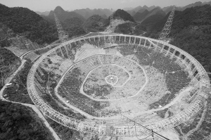 7月27日拍摄的正在建设中的500米口径球面射电望远镜。正在贵州黔南安装建设的500米口径球面射电望远镜(FAST),是目前世界上在建的口径最大、最具威力的单天线射电望远镜。目前,FAST已经完成索网制造与安装工程和支撑框架建设,即将进行反射面面板拼装。这一超级望远镜有望在2016年9月建成,建成后将成为世界级射电天文研究中心。 新华社发