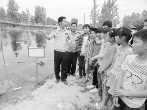7月23日,商水县舒庄派出所民警在汾河边对附近村的留守儿童进行防溺水安全教育。为防止农村留守儿童溺水事件的发生,暑假期间,该所组织民警深入村庄、河边、坑塘边对农村留守儿童进行防溺水安全教育,并在危险地段设立警示牌。(乔连军 摄)