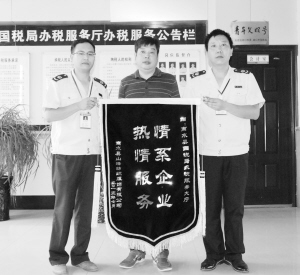 7月23日,商水县山峰纺织服饰有限公司将一面写有“情系企业 热情服务”的锦旗送到商水县国税局办税服务厅,感谢办税服务厅工作人员为其提供的优质高效服务。据悉,7月22日,该企业办税员到办税服务厅办理业务时发现,因增值税防伪税控盘出现错误,致使其无法正常领用增值税专用发票。了解到这一情况后,该局办税厅工作人员协同技术人员利用中午休息时间帮其解决了问题,并为其办理了相关业务。 谢晓宇 摄