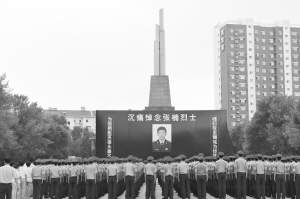 在悲恸的哀乐声中,参加告别仪式的全体人员肃立,向张楠烈士默哀三分钟。悼词简要介绍了张楠烈士生平,并称赞他是有灵魂、有本事、有血性、有品德的新一代革命军人,是献身警卫事业、建设精锐之师的杰出代表。