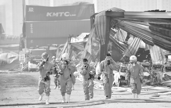 8月16日,救援人员继续深入天津港“8·12”瑞海公司危险品仓库特别重大火灾爆炸事故现场开展救援工作。新华社发