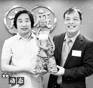 日前,应香港中华厂商联合会的邀请,张振福携45件陶瓷泥塑作品随豫商文化促进会代表团赴香港展出。此次展出的泥塑作品取材于上世纪六七十年代豫东百姓的生活片段、劳动场面,如《推石磨》、《童年时光》、《说评书》、《炕头》、《踢毽子》、《丰收乐》等,让人耳目一新的艺术作品吸引了千余名港人参观。图为张振福向香港中华厂商联合会会董余德明赠送钧瓷泥人《青春》。 王泽远 摄