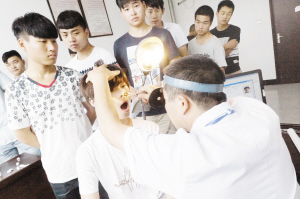今年,项城市广大青年的入伍积极性高涨。图为应征青年们正在参加体检。
