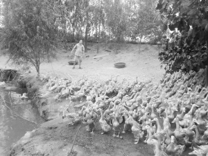 右图 扶沟县练寺镇董王村农民王孟辉投资30余万元利用荒坑、荒地搞立体养殖,岸上养殖蛋鸭,坑塘内养鱼,取到了较好的经济效益。