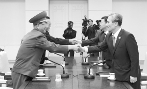 8月22日,在韩朝边界板门店韩方一侧的“和平之家”,韩方代表青瓦台国家安保室室长金宽镇(前右)和朝鲜人民军总政治局局长黄炳誓(前左)在会谈前握手。当日,韩朝双方在韩朝边界板门店韩方一侧的“和平之家”举行高级别对话,就目前朝鲜半岛局势等事宜进行磋商。 新华社发