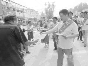 为推动逢九“村务日”的深入开展,扎实推进基层四项基础制度建设,太康县清集镇利用集镇逢集之际召开了“清集镇逢九‘村务日’宣传月”动员大会,并组织近百名“村务日”宣传员上街发放太康县逢九“村务日”宣传单。图为镇党委书记刘东带领宣传员向群众发放宣传单。(李陆军 摄)