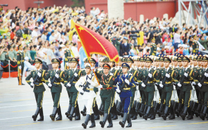 8月22日夜间至23日上午,纪念中国人民抗日战争暨世界反法西斯战争胜利70周年大会专项演练在北京天安门地区及长安街沿线举行。图为参加演练的三军仪仗队(8月23日摄)。