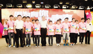 图为尹晋华、徐光、李若鹏向受助学生代表发放贫困助学金并合影留念。记者 王映摄