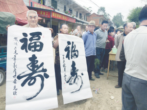 9月17日上午,送书画下乡工作队队员展示书画作品。当日,县文联组织践行“三严三实”送书画下乡工作队,携县书法协会、县美术协会若干成员到洪山镇姜桥行政村,开展了送书画下乡活动。(张娜 摄)