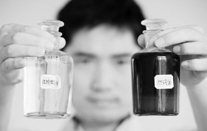 “地沟油”变废为宝 在江西省上饶县冠牛生物科技有限公司,工作人员展示“地沟油”(右)和“生物柴油”的样本(9月29日摄)。江西省上饶县冠牛生物科技有限公司以餐厨废弃油脂(俗称“地沟油”)作为原材料,利用专利生产技术,加工生产生物柴油、工业油脂等再生资源,将恶臭难闻的“地沟油”变废为宝。据了解,目前该厂每天生产100多吨生物柴油,消耗“地沟油”120吨。新华社记者 万象 摄