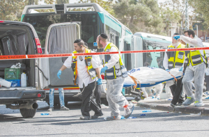 以巴地区同日发生4起袭击事件致5死26伤 10月13日,以色列救援人员在耶路撒冷的公共汽车袭击现场工作。 以色列警方女发言人卢巴·萨姆里说,耶路撒冷和以色列西部城市赖阿南纳当日上午几乎同时发生4起巴勒斯坦人袭击以色列人事件,造成至少3名以色列人死亡,26人受伤,2名巴勒斯坦袭击者被打死。 新华社发