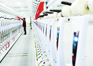 扶沟县是全国第二大产棉县、优质棉生产出口基地县,棉花种植面积多年稳定在50万亩以上,年产皮棉5万多吨。为打造培植“优质棉基地”这张全国名片,该县不断优化经济发展环境,加大招商引资力度,吸引了中方等一大批纺织企业落户该县,同时带动了相关产业良性发展。图为扶沟县某棉纺企业车间一角。记者 沈湛 摄