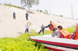 路面脏了有环卫工打扫,水面脏了谁来治理?10月14日,川汇区水利局及沿河办事处组织开展沙颍河水面漂浮物治理行动。受多方面因素影响,沙颍河水面漂浮杂物较多,严重影响市容市貌,污染水资源。川汇区把河道及水面环境卫生管理作为城市管理的一项重要工作,纳入政府议事日程,加大资金投入力度 ,每年安排一定的预算资金用于河道及水面的环境卫生治理。此次治理活动,川汇区出动5条快艇,对中州路桥至大庆路桥之间3.5公里水域进行全面治理,预计工期一周左右。图为水利局工作人员正在清理岸边生长的水草,随后将其拉至下游河滩内运走。记者 徐启峰 通讯员 刘巍 李影摄影报道