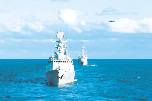首先进行的是编队运动演练,指挥舰为济南舰。中法3艘舰艇到达约定汇合点后,以济南舰为基准组成单纵队,在海面上犁出一道壮丽的白色航迹。随着“组成方位队航行”命令的下达,3艘舰艇迅即大角度齐转调整队形。在接下来的编队运动中,中法参演舰艇先后进行了人字队、单横队、方位队等队形调整。