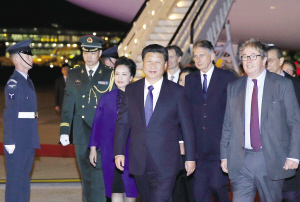 当地时间晚8时许,习近平乘坐的专机抵达伦敦希思罗机场。习近平和夫人彭丽媛在机场受到英国女王代表胡德子爵、外交大臣哈蒙德等热情迎接。英国青年向习近平夫妇献上鲜花。