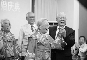 10月20日,在广内街道核桃园社区,参加金婚庆典活动的84岁老人王克超(前右)在与妻子、82岁老人史洁明(前左)展示戒指。俩人已经结婚63年。