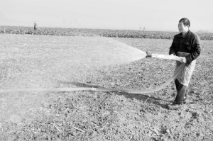 连日来,受降雨偏少和晴好天气影响,商水县出现了旱情。为了确保冬小麦顺利播种、提高出苗率,当地农民掀起了抗旱保秋播的高潮。图为练集镇杨庄村农民正在给播种后的麦田浇水。刘飞 摄