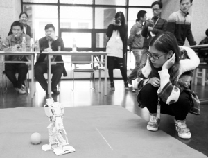 天津大学生机器人大赛拉开帷幕 10月25日,一名女大学生关注自己的机器人参加“类人机器人竞技体育全能挑战赛”点球项目的比赛。当日,2015年第三届天津市大学生机器人大赛暨华北五省(市、自治区)大学生机器人大赛天津赛区大赛在天津工业大学正式开赛。新华社发