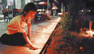 老挝民众庆祝送水节 10月27日,在老挝首都万象,一个女孩在家门口点燃蜡烛祈福。当日是老挝的传统佛教节日送水节,又叫出夏节、出腊节、出雨节等。送水节与迎水节相对应,是当地最重要的佛教节日之一。老挝民众除在寺庙进行布施和祈福仪式之外,晚上还会在河边放水灯,所以这个节日也会被称为“水灯节”。