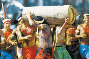 妙趣横生的首届世界土著人运动会 图为10月27日,巴西土著运动员在参加扛木桩接力赛。号称土著人“奥运会”的首届世界土著人运动会10月23日至11月1日在巴西中部小城帕尔马斯进行,全世界的土著人齐聚这里,揭开了神秘面纱,展现源于他们生活的体育运动,没人宣扬“更高、更快、更强”,他们的中心思想只有一个——好玩。