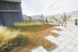 雨水收集 循环再用 这是10月27日在加拿大温哥华拍摄的具有雨水收集循环再用功能的建筑楼顶。一栋位于加拿大温哥华市区的新型商业大楼成为加拿大首个获“鲑鱼安全”环保认证资格的城市建筑物。它具有雨水收集和循环再用功能,能将雨水收集之后,用作大楼内厕所冲洗与灌溉花草之用。