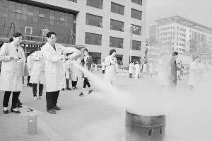 为提高广大医护人员消防安全意识,掌握消防基本知识,进一步做好消防安全工作,确保医院安全生产,近日,周口协和骨科医院举行秋季消防演练。此次演练,为职工上了一堂消防安全意识课,增强了职工消防安全意识,取得良好效果。图为演练现场。记者 史书杰 摄