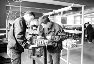10月28日,两名工人在淮阳县产业聚集区内某电气车间认真工作。该县产业集聚区基础设施的完善吸引了沿海产业转移企业的入驻,使得智能电气产业异军突起,目前智能电气机械装备产业年产值近7亿元,成为该县的“朝阳产业”。