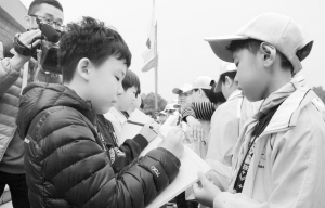 中韩小记者山东“手牵手” 11月5日,在山东台儿庄大战纪念馆,韩国小记者为中国小记者签名留念。当日,中韩两国小记者联谊活动在山东台儿庄举行。两国小记者共同参观台儿庄大战纪念馆,并互赠礼物和签名留念。新华社发