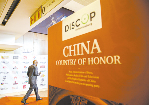 中非影视携手谋共赢 11月4日,在南非约翰内斯堡举行的2015年非洲电视节上,一名参观者走过中国作为主宾国的宣传海报。2015年非洲电视节4日在南非最大城市约翰内斯堡开幕,中国作为本届电视节主宾国成为一大焦点。新华社发