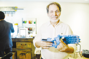 11月4日,E-NABLE公益组织的创始人乔恩·舒尔博士在纽约展示采用3D打印技术制作的假肢。来自美国的一家公益组织E-NABLE从2012年开始,通过开源式设计和大规模定制等方式,为30多个国家的1000多名残疾成人和儿童使用3D打印技术义务制作假肢。 新华社发