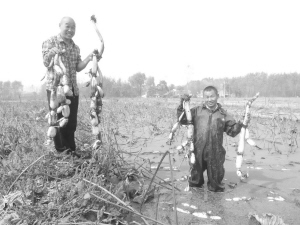 商水县化河乡宁楼行政村李金芳高产莲藕泥鳅种植养殖合作社培育的水果莲藕和优质泥鳅,供不应求,除在本地种植销售外,共带动全国种植1.6万亩,成为潜力很大的农民致富项目,引起当地政府的重视和支持。图为种植户试采今年的莲藕。记者 刘彦章 摄
