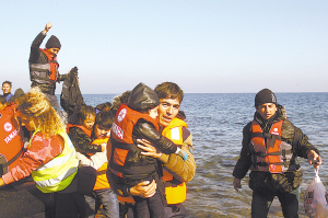 11月8日,来自叙利亚和阿富汗的难民乘坐小船抵达希腊的莱斯沃斯岛。