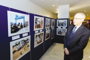 为和平而来——中国军队参加联合国维和行动25周年图片展在联合国总部开幕 11月9日,在位于美国纽约的联合国总部,联合国维和事务助理秘书长埃德蒙·穆莱特观看“为和平而来——中国军队参加联合国维和行动25周年图片展”。新华社发