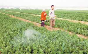 雨后转晴,扶沟县菜农及时为蔬菜松土喷药,防治蔬菜沤根和病害的发生。图为城郊乡博旭合作社的社员正在为露地芹菜喷药防治软腐病。