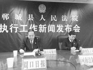 本报讯 (记者 卢好亮 通讯员 孙涛 曹磊 文/图) 11月6日下午,郸城县人民法院召开执行工作新闻发布会(如图)。《河南法制报》、《周口日报》、县电视台等多家媒体应邀参加发布会。发布会上,该院执行局负责人向媒体通报了一年来郸城县人民法院执行工作情况,并回答了记者提问。