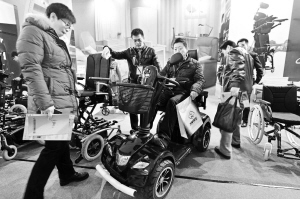 11月13日,观众在老龄产业博览会体验老人代步车。当日,为期3天的2015北京国际老龄产业博览会在北京展览馆开幕。来自国内外70余家企业参展,产品涉及养老机构、老年地产、康复辅具等。新华社发