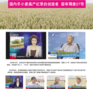 市农科院自1978年开始小麦遗传育种和栽培技术研究,从最初的周麦8048到现在的周麦32号,先后培育了34个小麦品种,其中,国家审定11个,河南省审定16个。“周麦”系列品种累计推广种植4亿亩,新增粮食200亿公斤,为国家粮食安全做出了重大贡献。2014年,“周麦”系列品种占全省小麦种植面积的1/4,是我省小麦第一大推广品种。在周口,以周麦22号、周麦18号、周麦16号、周麦24号为主的“周麦”系列种植面积达430万亩,占总麦播面积的 43.3%。周麦16号、周麦22号连续5年蝉联河南省十大推广品种。特别是周麦22号成为国内第二大、河南省第一大推广品种。2015年,“周麦”系列品种在黄淮麦区推广2800万亩,其中河南省2000多万亩,占全省麦播面积的25%。最新育成的新品种周麦26号、周麦27号、周麦28号表现出高产、稳产、多抗、广适、优质的突出优点,是理想的接班品种。在去年的夏粮生产中,周麦26号、周麦27号示范方实打验收中,分别以平均亩产761.9公斤、821.7公斤,创造了国内强筋小麦千亩高产示范方实收最高亩产纪录和国内冬小麦单产最高纪录。今年,周麦27号以平均亩产780.9公斤的佳绩,创造了国内冬小麦千亩方单产纪录,再次受到中央电视台、《人民日报》等多家媒体的关注。