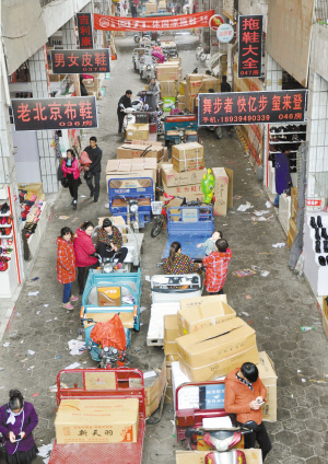 走进市场内部,荷花市场的凋敝举目可见,狭窄的过道阴暗潮湿,墙体破旧,雨阳篷烂了许多洞,雨水飘进,地面泥泞不堪。荷花市场二期鞋业区,老板张国芳正在打包存货,准备往华耀城搬。“十人九想法,不管别人咋看,我是想搬。这地方太挤了,环境也差,一下雨房子就漏得不行,就这样房租还一年一涨,还是搬走好。”离他不远处有个公厕,收费人抱怨道:“别看外面热闹,来方便的人比以前至少减少了一半。”许多店铺虽然开着门,但顾客很少。“其实最近两年的行情已经不好了。”一位店主叹着气说,“我去过临沂,也到过江浙一带的市场。老实说,在这赚钱不赚?赚!但外地像我们这个层次的市场已经很少了。说句不中听的话,不能进来看,它也真不该在市中心这个地段。”