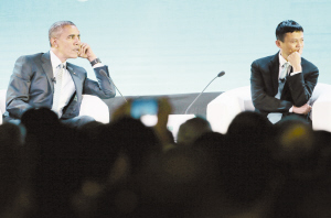 奥巴马与马云出席2015年亚太经合组织工商领导人峰会 11月18日,在菲律宾首都马尼拉,美国总统奥巴马(左)与阿里巴巴集团董事局主席马云在峰会上对话。当日,2015年亚太经合组织(APEC)工商领导人峰会在马尼拉举行。新华社发