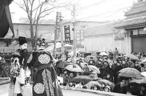 为丰富农民群众的业余文化生活,项城市深入实施文化惠民政策,着力构建公共文化服务体系,持续开展了“送戏下乡”活动,让群众在家门口享受了一场场文化盛宴,丰富了群众的精神文化生活。图为11月17日,项城市豫剧团正在孙店镇广阳村冒雨演出,吸引了数百名群众前来观看。 张永久 摄