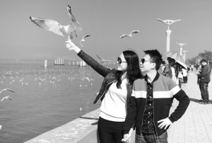 人鸥同乐 11月20日,游客在滇池草海大坝上给红嘴鸥喂食。当日,抵达昆明越冬的红嘴鸥在滇池草海上空翩翩起舞,吸引众多市民与游客前来观赏。每年10月底至11月初,成千上万只红嘴鸥飞抵昆明越冬,成为“春城”的一道风景。新华社记者 胡超 摄