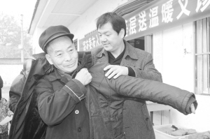 天气渐渐寒冷,项城市组织开展“下基层、送温暖”活动,让困难群众感受到了党和政府的温暖。该市第一人民医院的热心职工为官会镇范桥村的孤寡老人、低保困难户捐送了160余件棉衣、棉裤等。图为该院职工帮助老人穿棉衣。 张永久 摄