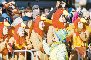 11月26日,在美国纽约, 身着火鸡服装的人们观看梅西感恩节大游行。当日,纽约举行第89届梅西感恩节大游行,精彩的游行表演、各种气球造型巡游等,吸引数百万民众前来观看。梅西感恩节大游行始于1924年,是全美规模最大的感恩节游行。