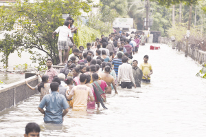 印度金奈持续降雨 12月2日,在印度金奈,人们在洪水泛滥的道路上涉水前行。持续近一个月的降雨导致印度泰米尔纳德邦首府金奈机场关闭,多条道路受阻。当地官员称,洪水已造成上万人受灾。新华社发