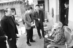 周口“面条哥”郭良山夫妇4年资助40多名贫困生的善举被多家媒体报道后,他们成了宁夏的“新闻人物”。感人事迹传到家乡后,商水县长马卫东作出批示,要求全面宣传郭良山夫妇的事迹。日前,商水县委常委、宣传部长韩林到舒庄乡郭大寨村慰问郭良山的母亲。记者 岳建辉 摄